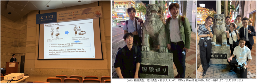 10/22 – 25 の日程で,The Eleventh JSME-KSME Thermal and Fluids Engineering Conference (J-K TFEC11) が沖縄コンベンションセンターで開催されました(https://tfec11.jp/).当研究室から,數見さん,小林くん,藤原くん,藤澤くん,長井くんが発表しました.今回も先生方から,発表内外で温かいご指導やアドバイス,お言葉を頂戴いたしました,誠にありがとうございました.今後ともご指導ご鞭撻のほど,何卒よろしくお願い申し上げます(アイキャッチは福留先生もご一緒いただきました).